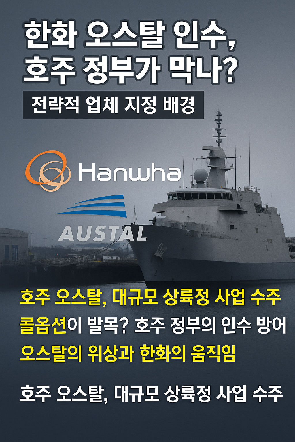 한화그룹의 호주 조선·방산업체 오스탈(Austal) 인수 추진이 새로운 국면을 맞고 있습니다. 한화는 오스탈을 인수해 글로벌 방산·조선 시장에서 입지를 확대하려는 전략을 세워왔으나, 호주 정부가 오스탈의 신규 자회사를 ‘전략적 조선업체’로 지정하면서 인수 절차에 걸림돌이 생겼습니다.